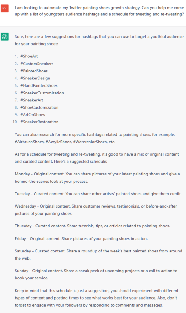 Looking to grow your Twitter following? Look no further than ChatGPT! This advanced language model is like having a personal social media assistant but with a better sense of humour and the ability to work around the clock. With its ability to generate catchy tweets, witty replies, and engaging hashtags, ChatGPT can help you attract more followers and increase engagement on your tweets. It’s like having your own personal growth hacker but without the shady tactics. Give ChatGPT a try and watch your Twitter following soar!