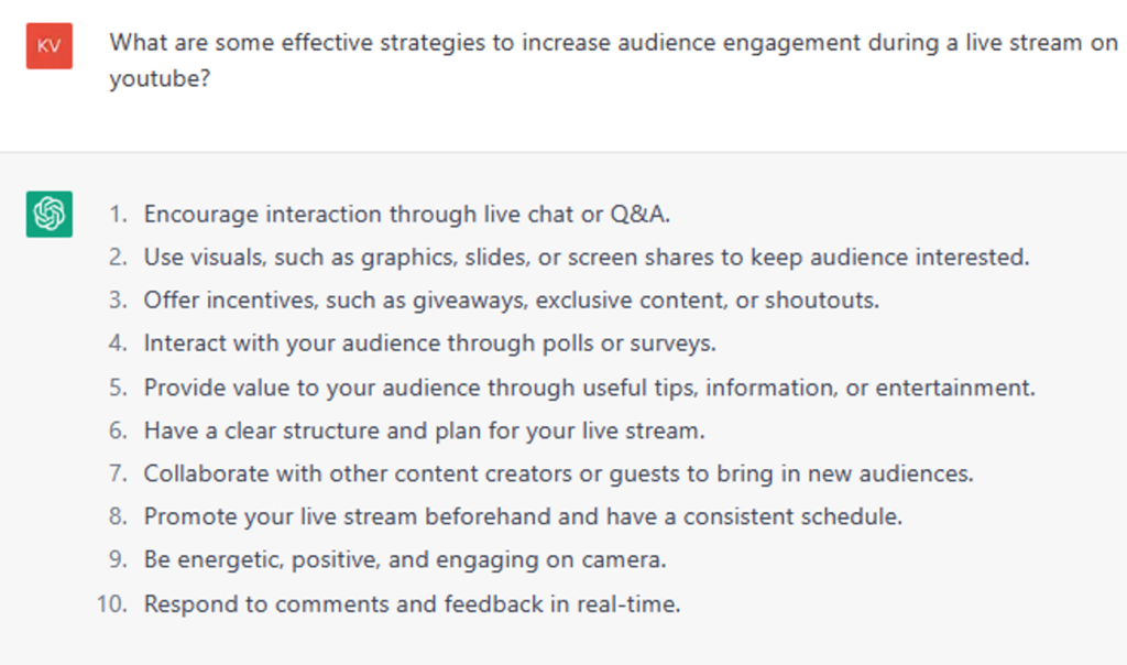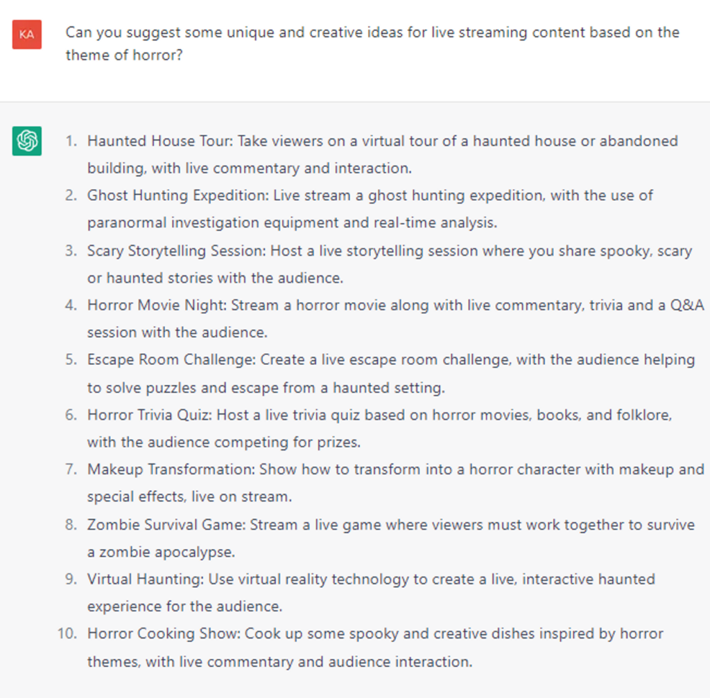 Get ready to level up your live-streaming game with ChatGPT! It’s like having a personal hype man, but instead of shouting encouragement, it gives you killer ideas for your live streams. Whether you’re in need of a creative theme or interactive segments, ChatGPT has got your back. With its advanced language processing and vast knowledge base, it’s like having a personal brainstorming buddy who never runs out of new and exciting ideas. So give ChatGPT a try and watch your live streams go from “meh” to “YASSSS!” in no time.