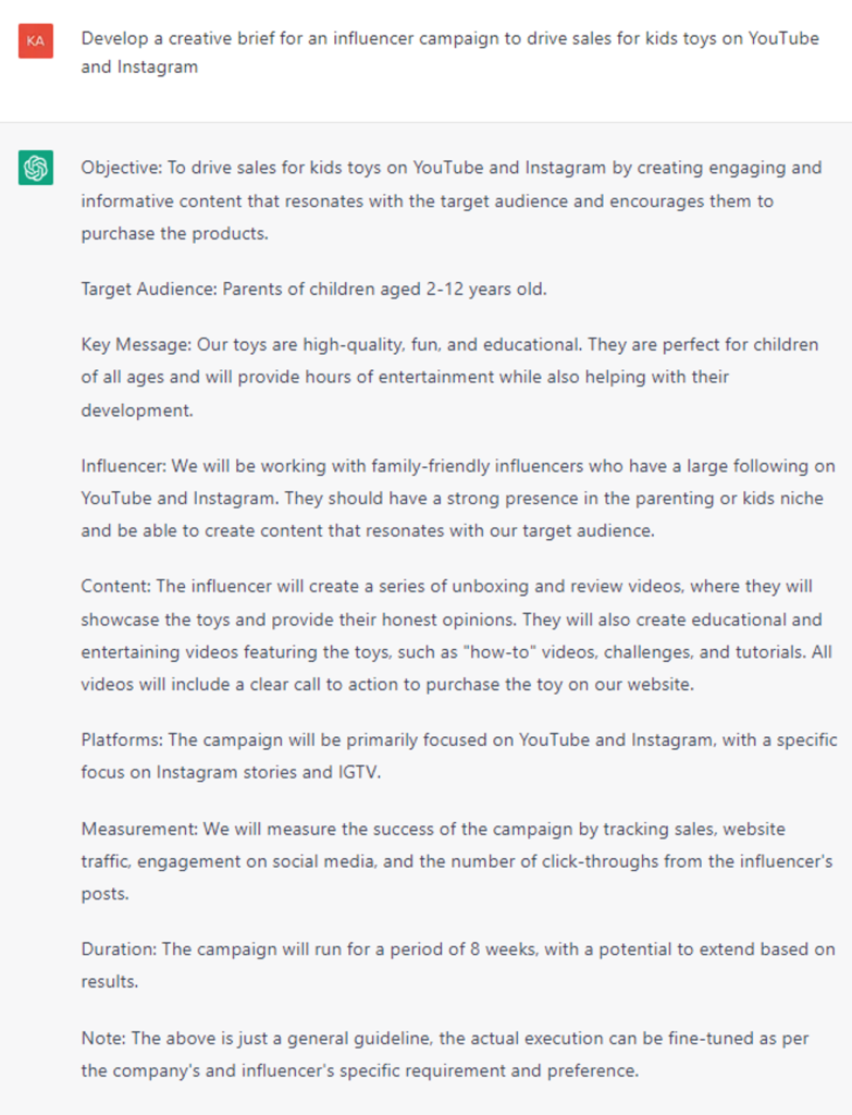 ChatGPT is the ultimate creative brief-writing machine! With its advanced language processing abilities, ChatGPT can help you craft the perfect pitch for any influencer. Whether you’re looking for a social media star or a YouTube sensation, ChatGPT has got you covered. Just give it a few details about your campaign, and it will spit out a creative brief so good, even Don Draper would be impressed. And let’s be real, who doesn’t love impressing Don Draper?