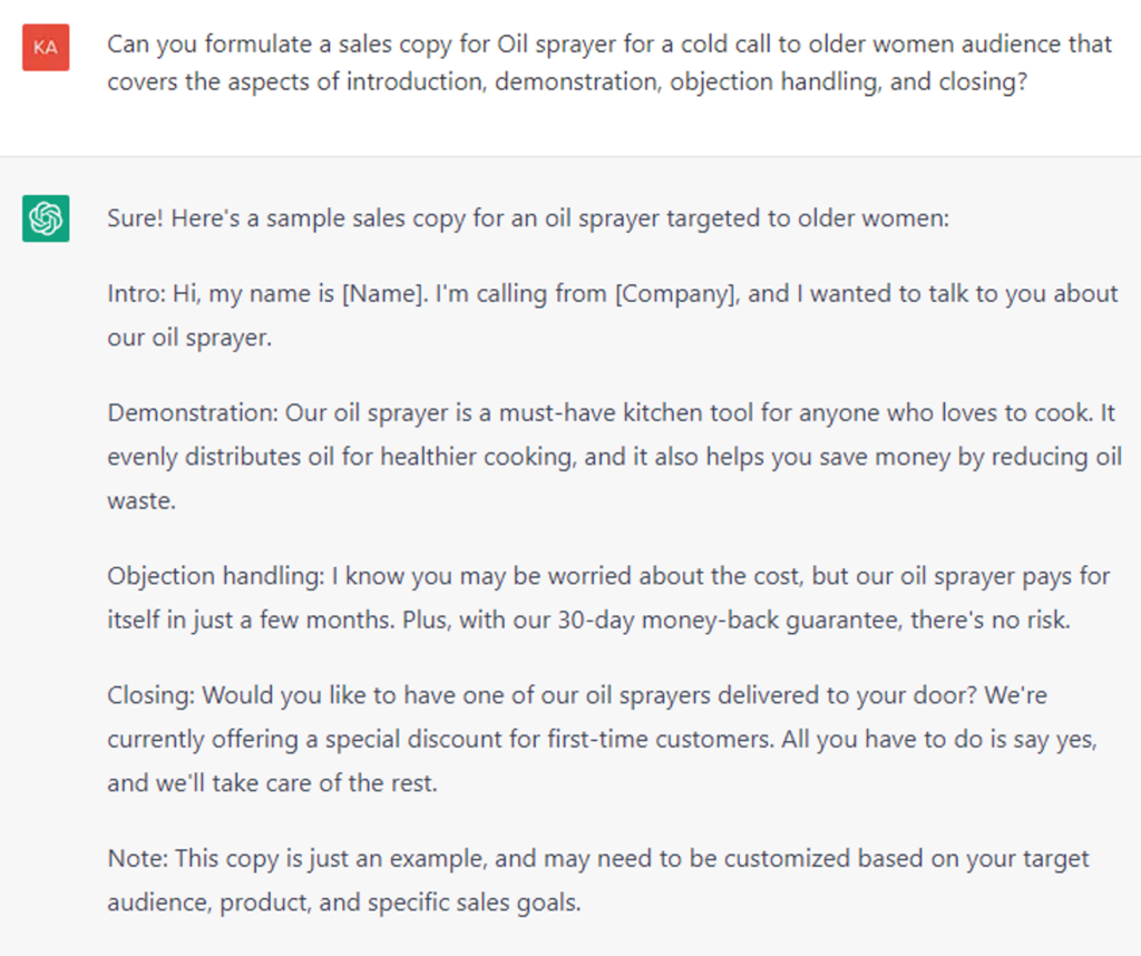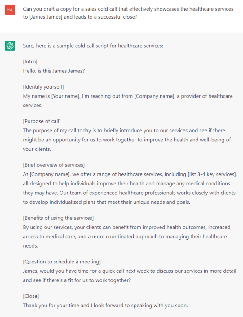 ChatGPT, the friendly language model, can help you write sales copy for cold calling that’s both persuasive and, well, not cold! Say goodbye to those awkward, uninspired pitches and hello to warm and witty words that will have potential customers eager to pick up the phone and chat. With ChatGPT by your side, you’ll be able to craft the perfect sales script that’s sure to leave a lasting impression. So, pick up the phone and give ChatGPT a call for your next cold call – you won’t be disappointed!